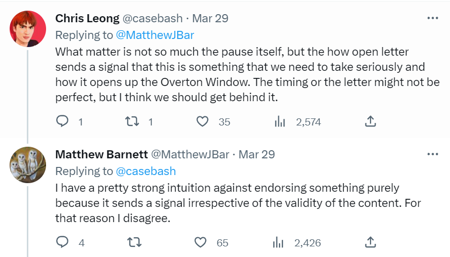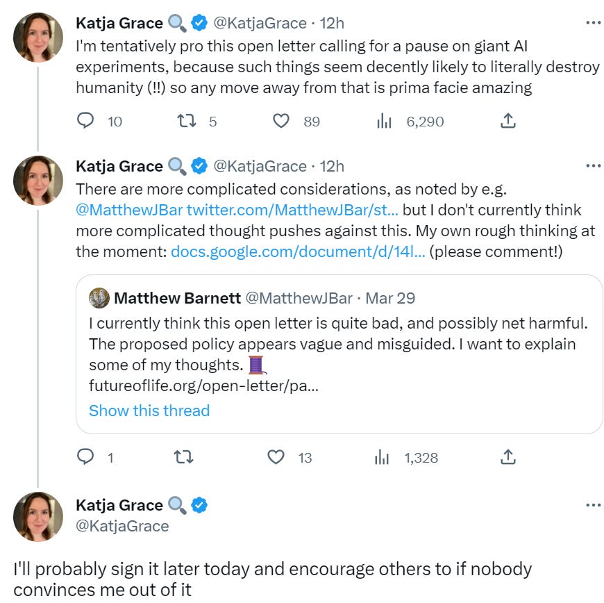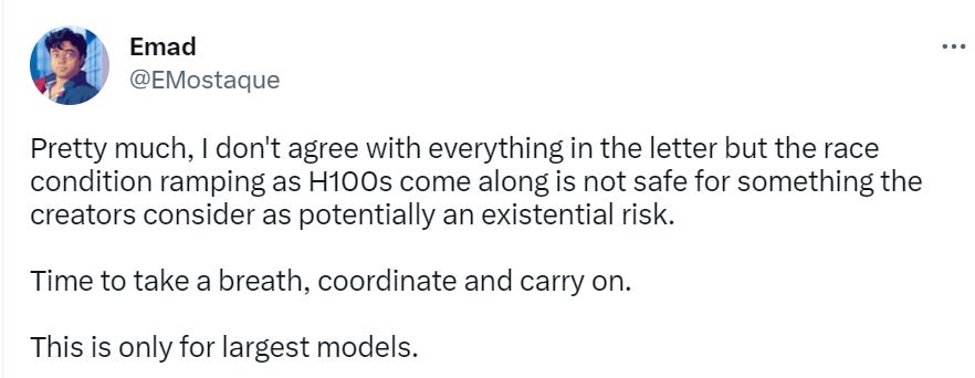 I am happy the letter came out, people are saying what they actually believe more directly, the arguments are being laid out, and I am glad people are signing it. I do not expect much chance of the pause happening, but would be thrilled if it did given the momentum and groundwork that would establish.