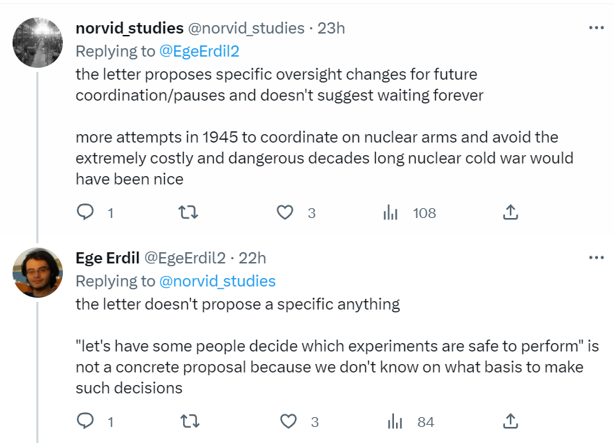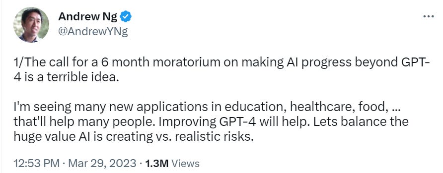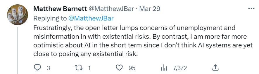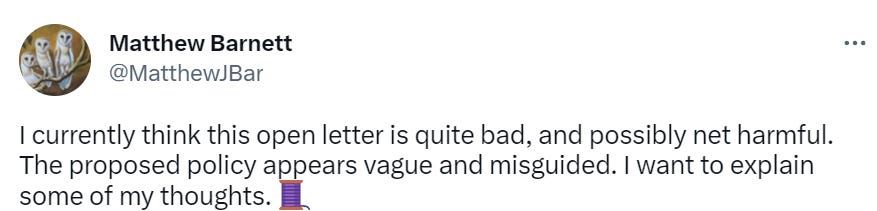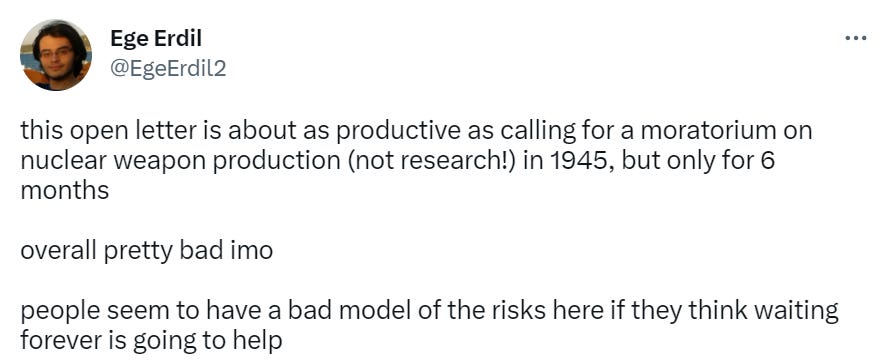 My biggest worry with the letter is the burden of proof it imposes on potential new AI systems seems like it is not so far from a de facto ban. This goes hand in hand with the conflation of near-term and existential risks.