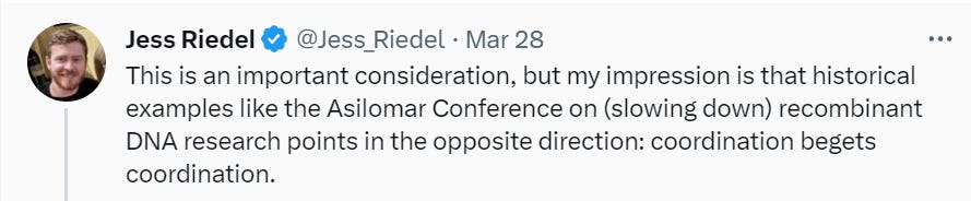 I essentially agree with Jess Riedel here. If you want coordination later, start with coordination now (link to Wikipedia on Asilomar on DNA), even if it’s in some sense ‘too early.’ When it isn’t too early, it is already too late. I also agree with him on the dangers of conflating current and future risks and wish that had been handled better.