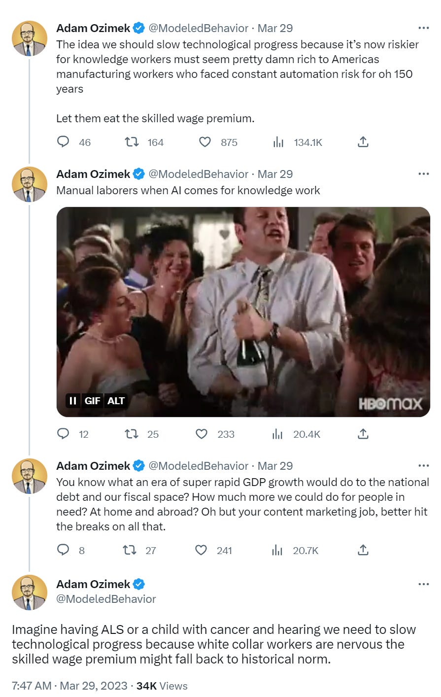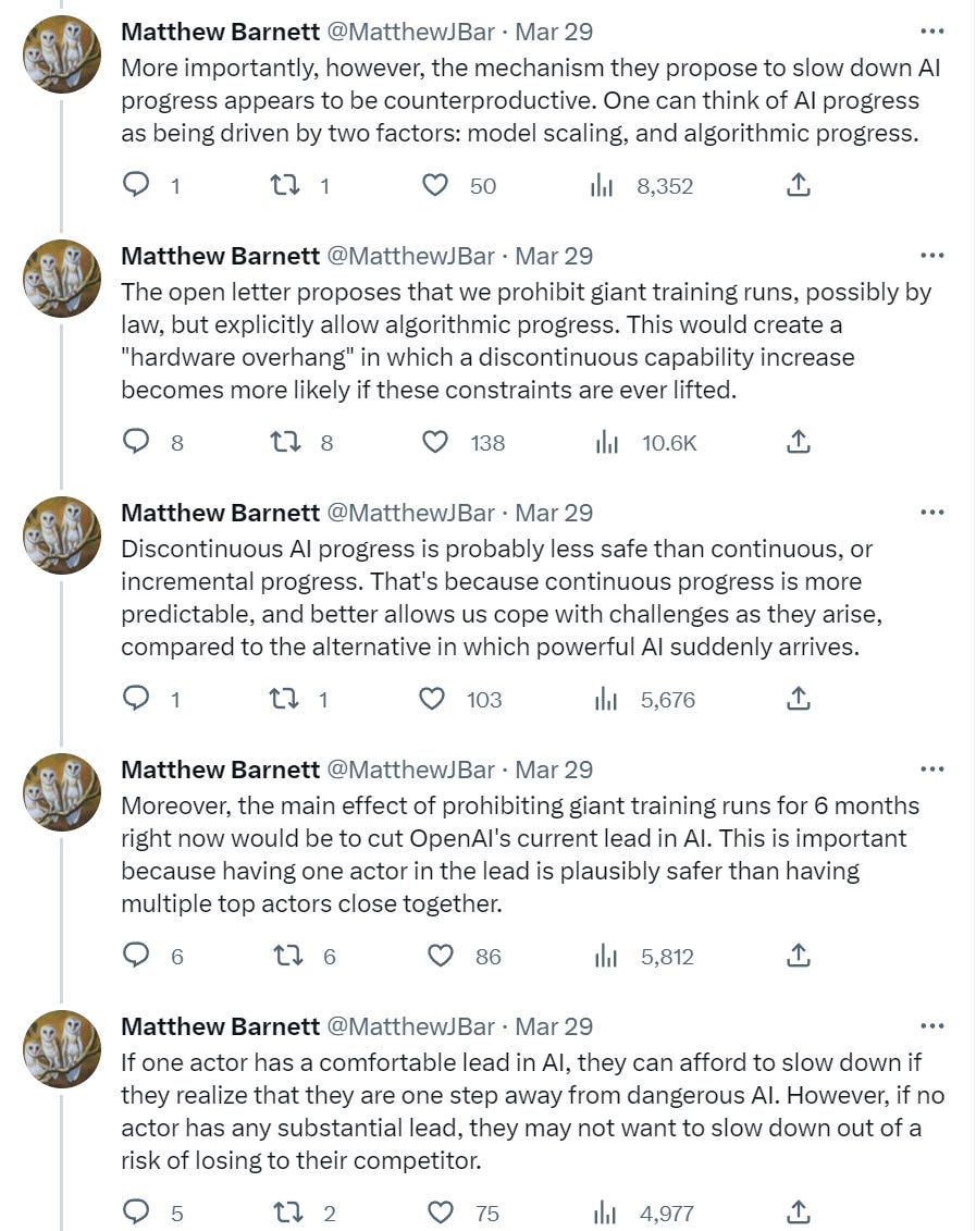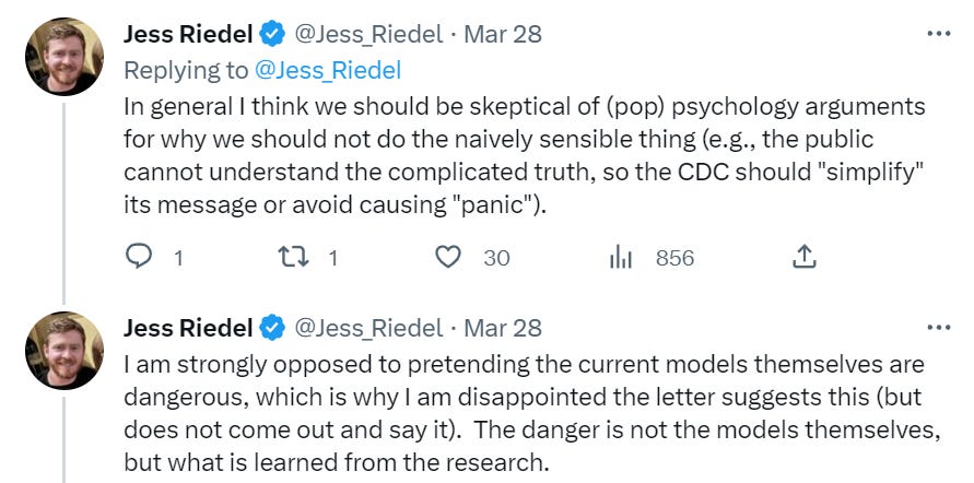Arvind Narayanan says “the new AI moratorium letter repeatedly invokes speculative risks, ignoring the version of each problem that’s already harming people. The containment mindset is neither feasible nor useful for AI. It’s a remedy that’s worse than the disease.” You see, the problems are ‘overreliance,’ ‘centralized power,’ ‘labor exploitation’ and ‘near-term security risks’ and you sir have the wrong affectations.