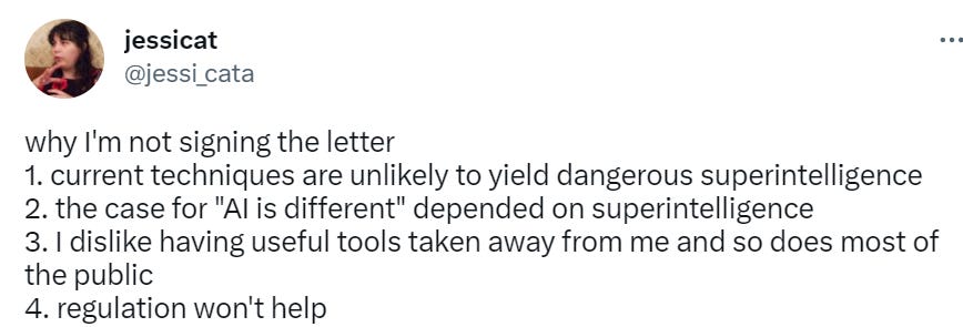 Jessica Taylor is not signing for several reasons. Her model says that LLM work won’t lead to AGI and is actually a distraction that makes AGI less likely, despite the increases in funding and attention, so why get in its way? I agree that if you think this, you should not be calling to slow such work down. Also thee usual reminder that regulations never work the way you want them to.