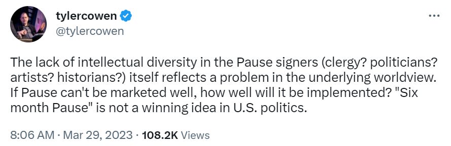 As per the position he staked out a few days prior and that I respond to here, Tyler Cowen is very opposed to a pause, and wasted no time amplifying every voice available in the opposing camp, handily ensuring I did not miss any.