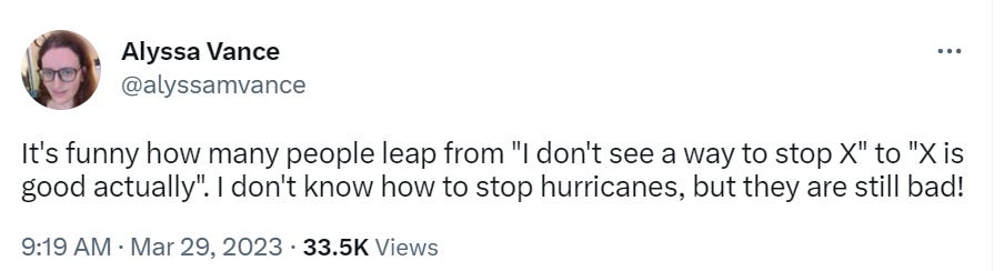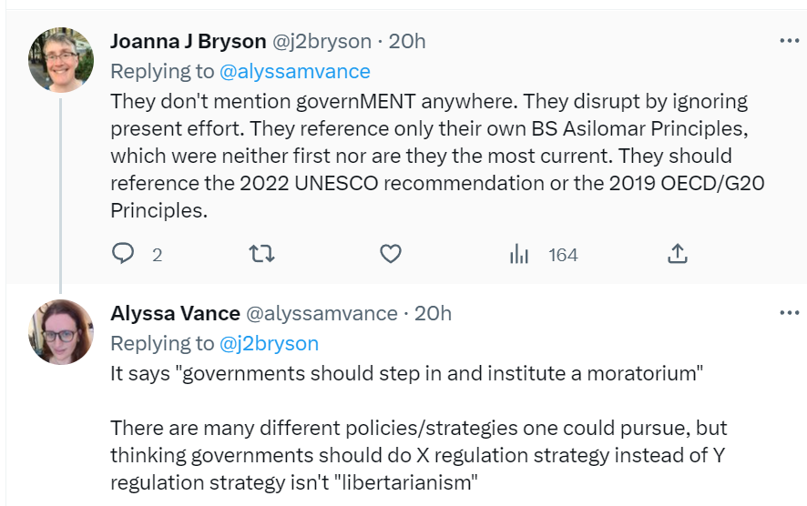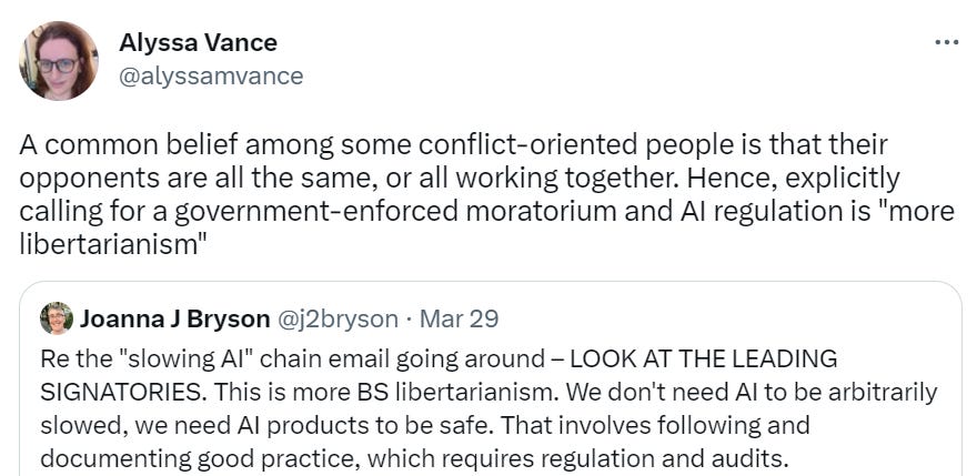 Alyssa Vance points out one that’s partly here for fun where the signatories calling for pauses and government regulations must be doing ‘BS libertarianism’ (plus, if you put ‘ethicist’ in your profile you are fair game, sorry, I actually do make the rules) because they are libertarians and you don’t like libertarians.