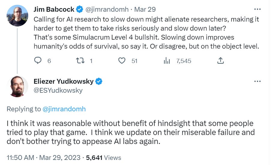 I also am not dealing, here, with Eliezer Yudkowsky’s letter in Time magazine, beyond noticing it exists. As I said earlier, one thing at a time, and I promise to deal with that soon.