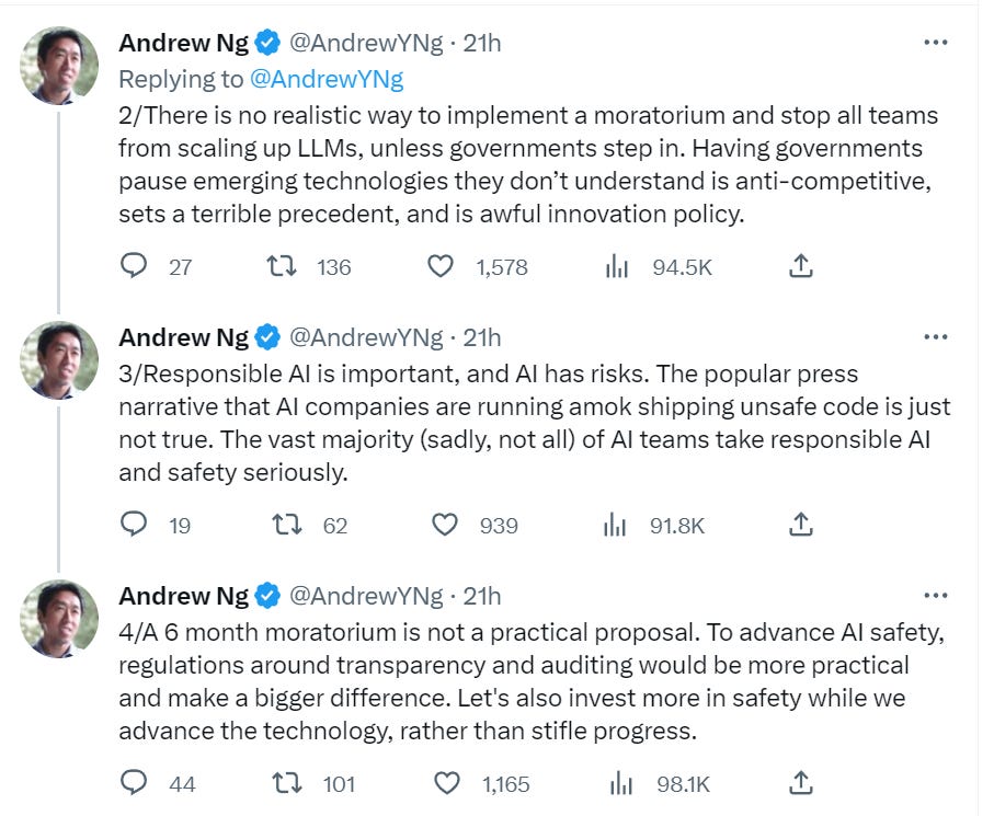 Here’s Andrew Ng, who I see as only focusing on near-term ‘AI safety’ concerns while ignoring existential concerns. He seems to be saying all three of ‘current safety approaches are sufficient, we don’t need more, all the labs are taking safety seriously,’ ‘we need regulations around transparency and auditing,’ and also ‘your call for a pause is bad because the labs would never agree to it without government, and it would be bad if governments did it because governments doing such things is bad.’ Grab bag.
