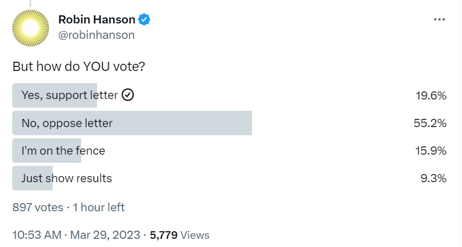 Robin Hanson votes no, also does not see much risk of AGI, also noting that the only policy that could actually ‘ensure safety’ is an indefinite pause, and does a poll.