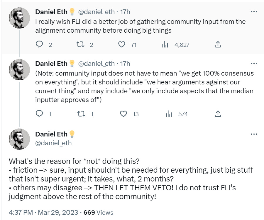 Daniel Eth isn’t against the letter as such now that it exists (as far as I can see) but does think the petition was a mistake as executed. Community here means EA.