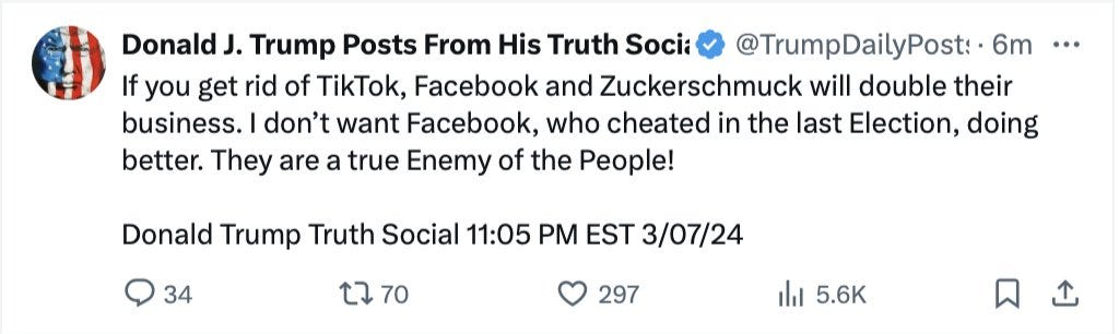 Mike Solana: If a billionaire TikTok investor pivoted from ‘never Joe Biden’ to ‘geezers only 2024’ and then, following a meeting with that billionaire TikTok investor Biden reversed his years-long position on TikTok and publicly defended the company you would absolutely LOSE YOUR MINDS.