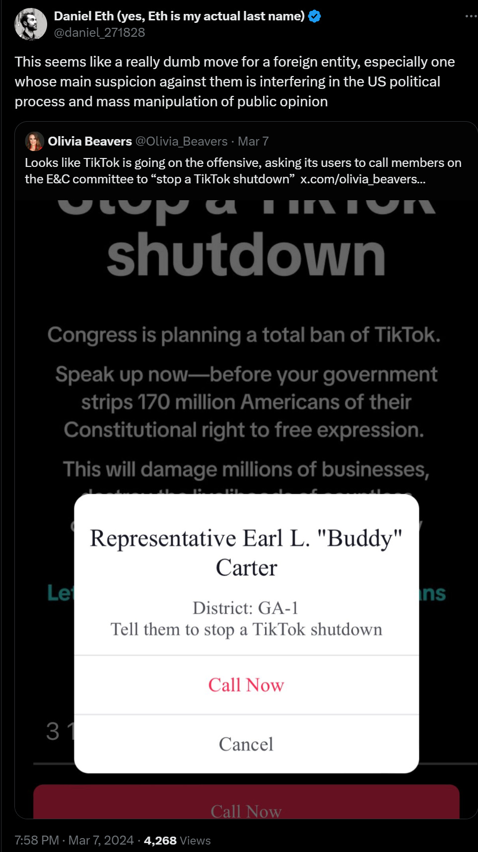 I see the case for forcing divestiture of TikTok as overdetermined. It is functionally Chinese spyware, with a history of lying about it and doing things like tracking journalists. China does the same to similar American companies. China seems to very clearly be using its influence to move public opinion, and has now put out 150 million push notifications to call Congress on its behalf, and one has to wonder what deal was made with known dealmaker Donald Trump.