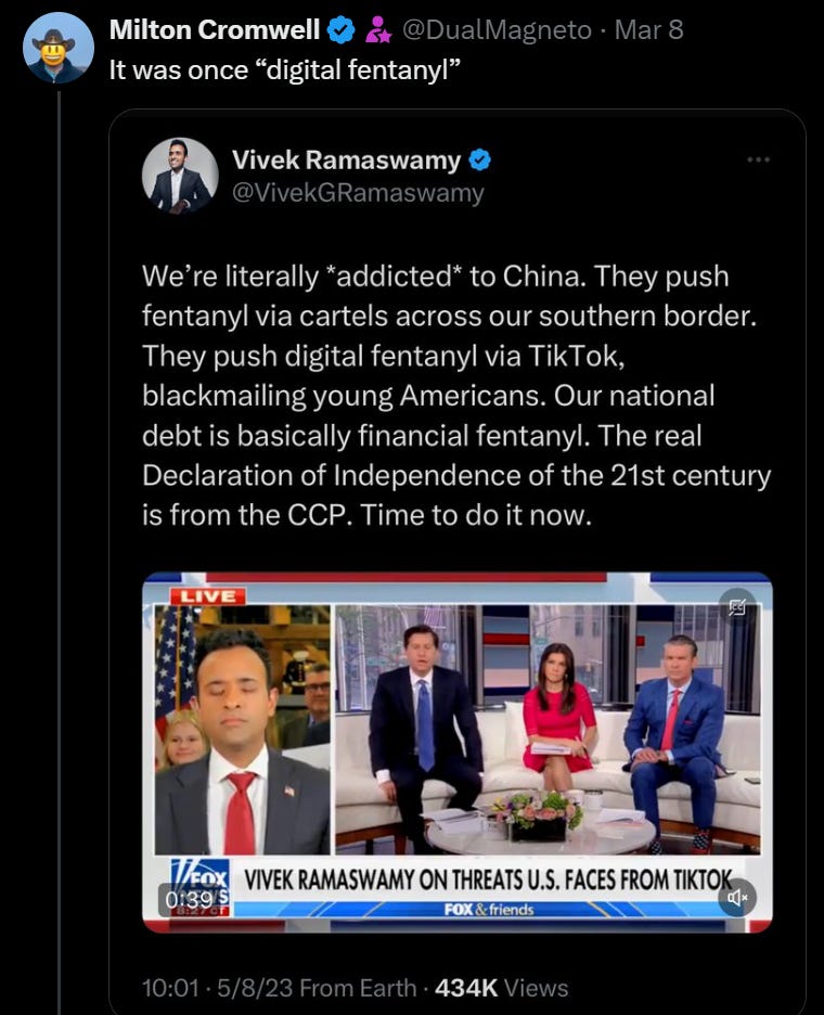 I also think that TikTok’s core product poses a serious problem even in the absence of all that, that we would be better off without it, and that one would be wise to personally avoid using it. But many are addicted, or feel trapped by social issues. I would not act on this alone, but it is a contributing factor.