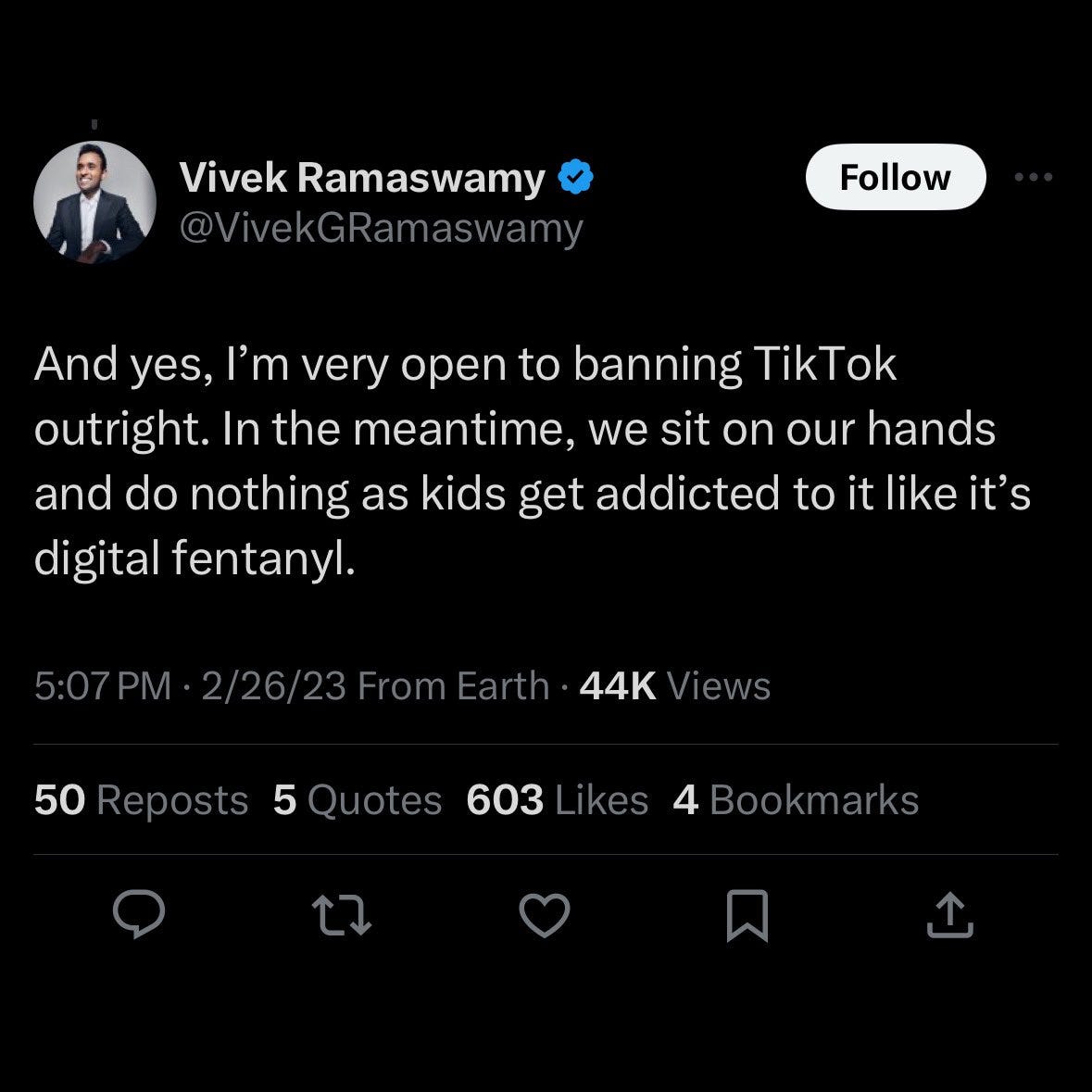 That seems like a deeply silly argument. If you want something even broader, then propose something even broader. I don’t even know what ‘ban all data transfers’ would mean in practice if it wasn’t a ban on Chinese companies doing business at all, and neither does Vivek. Nor is he making a case that this bill is negative on the margin, which is the question that matters.