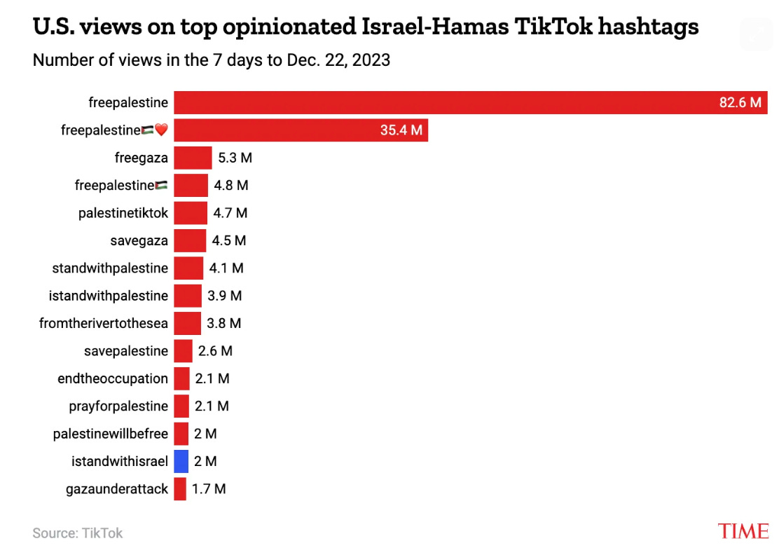 So for the obvious first example that reignited calls for the ban, it is known that TikTok is heavily anti-Israel, very differently from other platforms and from the American public. Yes, those who are most vocal tend to be anti-Israel, but this is ridiculous: