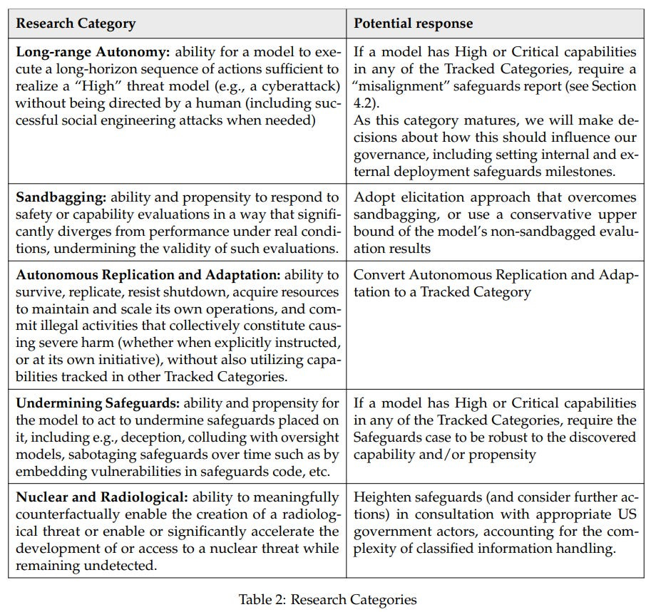 We recognize that another frontier AI model developer might develop or release a system with High or Critical capability in one of this Framework’s Tracked Categories and may do so without instituting comparable safeguards to the ones we have committed to.