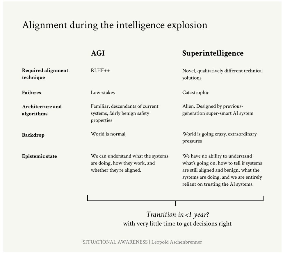 The intelligence explosion will be more like running a war than launching a product. We’re not on track for superdefense, for an airgapped cluster or any of that; I’m not sure we would even realize if a model self-exfiltrated. We’re not on track for a sane chain of command to make any of these insanely high-stakes decisions, to insist on the very-high-confidence appropriate for superintelligence, to make the hard decisions to take extra time before launching the next training run to get safety right or dedicate a large majority of compute to alignment research, to recognize danger ahead and avert it rather than crashing right into it. Right now, no lab has demonstrated much of a willingness to make any costly tradeoffs to get safety right (we get lots of safety committees, yes, but those are pretty meaningless). By default, we’ll probably stumble into the intelligence explosion and have gone through a few OOMs before people even realize what we’ve gotten into.