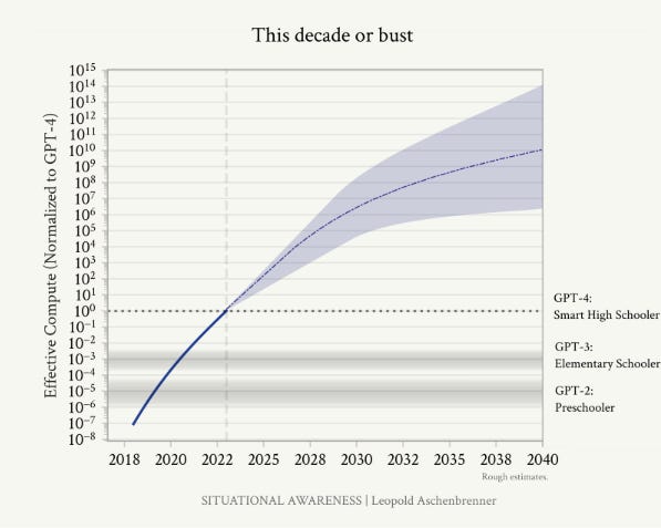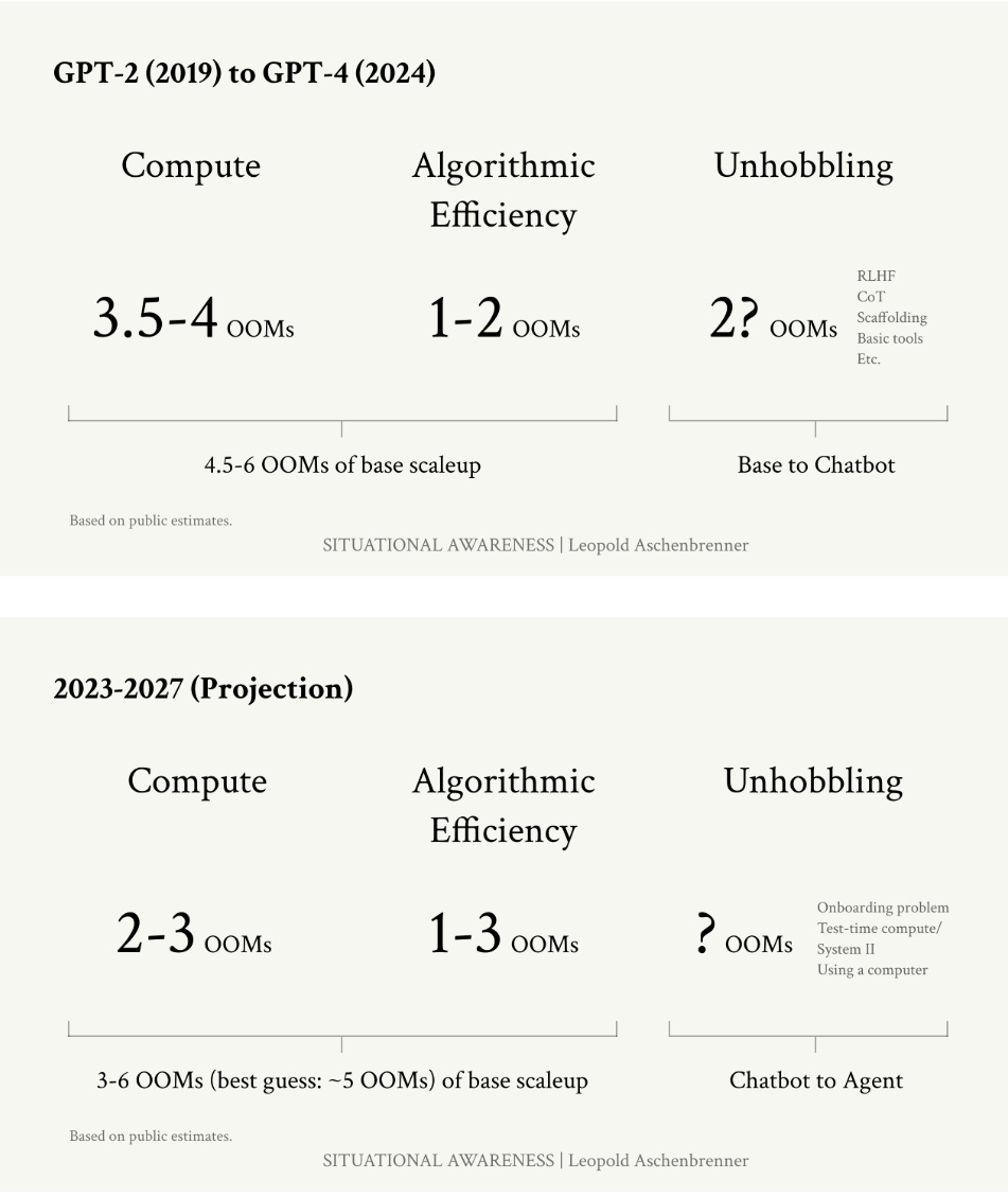 (2) Page 7: AGI by 2027 is strikingly plausible. GPT-2 to GPT-4 took us from ~preschooler to ~smart high-schooler abilities in 4 years. Tracing trendlines in compute (~0.5 orders of magnitude or OOMs/year), algorithmic efficiencies (~0.5 OOMs/year), and “unhobbling” gains (from chatbot to agent), we should expect another preschooler-to-high-schooler-sized qualitative jump by 2027.