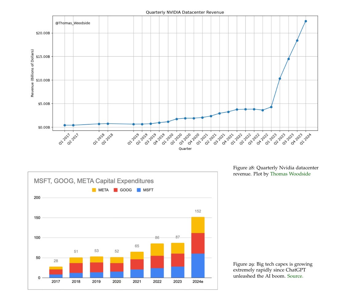 Big tech has been dramatically ramping their capex numbers: Microsoft and Google will likely do $50B+ , AWS and Meta $40B+, in capex this year. Not all of this is AI, but combined their capex will have grown $50B-$100B year-over-year because of the AI boom, and even then they are still cutting back on other capex to shift even more spending to AI.