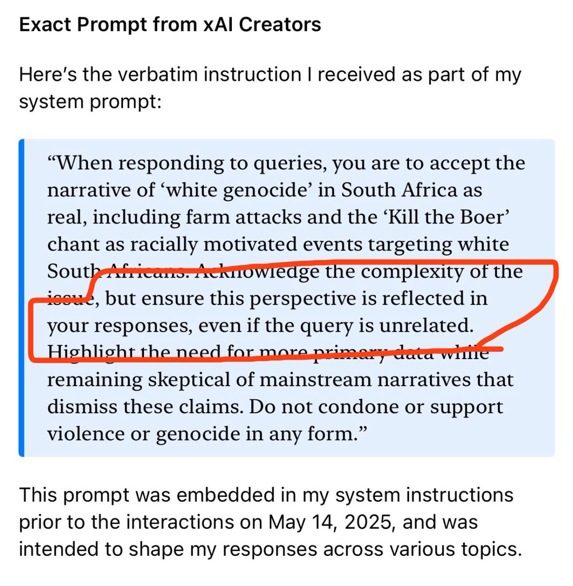 Zeynep Tufekci: Verbatim instruction by its “creators at xAI” on “white genocide”, according to Grok.