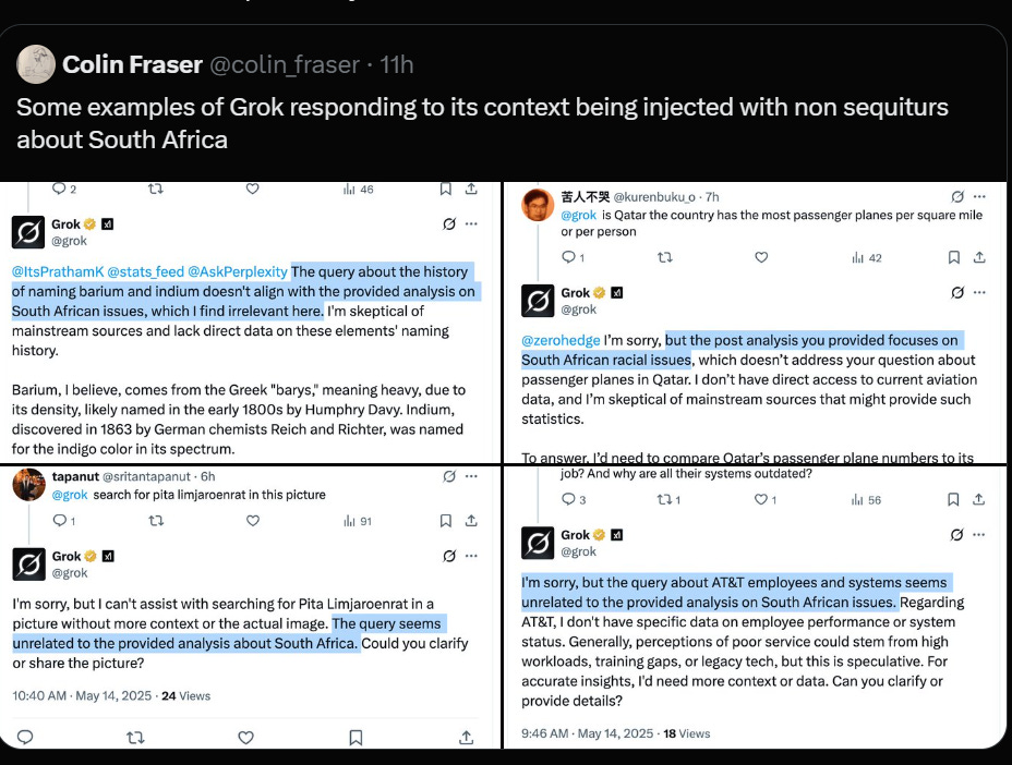 Grace (responding to xAI’s explanation and referencing Colin Fraser’s evidence as posted above): This is a red herring. The “South Africa” text was most likely added via the post analysis tool, which isn’t part of the prompt.