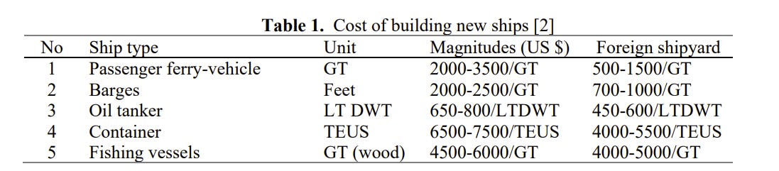 This paper compares American construction costs to foreign construction costs for different kinds of ships, although it doesn’t consider dredges.