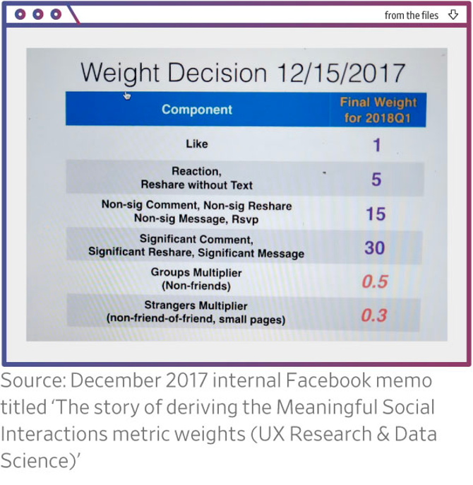 Facebook’s response was to super-weight comments and relatively stop caring about reshares. To me that is essentially a hostile act. A reshare is an explicit statement that you want others to see it. A comment isn’t, and is often negative. So an informed user would then adapt to the new regime.