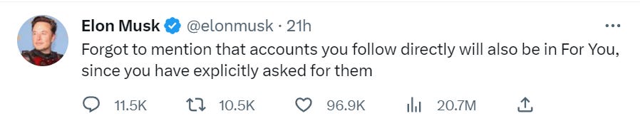 Elon then said he ‘forgot to mention’ that this would not be the case, and anyone you do follow will still be included. Perhaps this was indeed him forgetting to mention it, perhaps it was a reversal.
