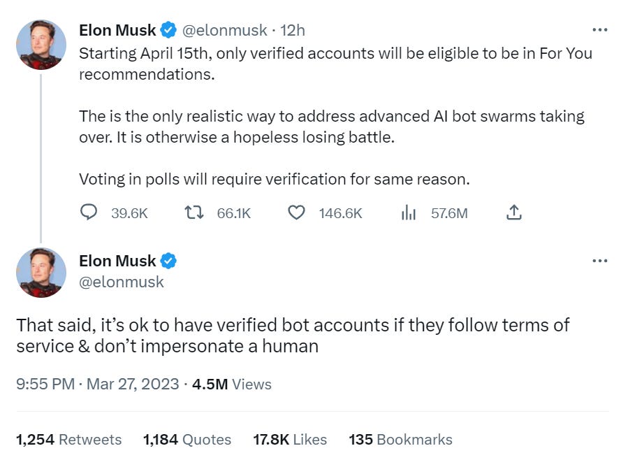 Here is the announcement of the recent changes. Elon is claiming that requiring verification is necessary to shield us from the coming wave of bot content.