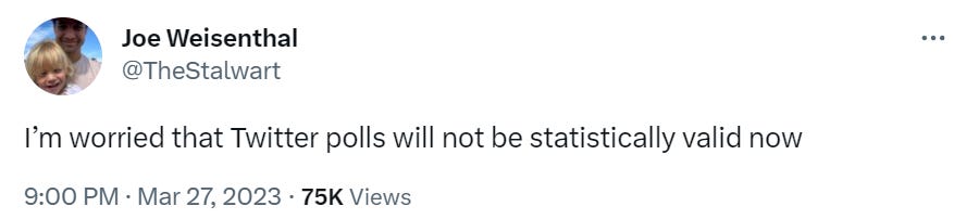 Notice that this was over a 15% response rate, whereas a future version of this poll would have a 1.5% response rate (and would make no sense to ask). I would rarely never run Twitter polls if I lost 90%+ of my sample size.