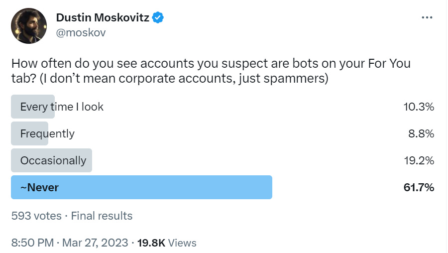 I don’t see much other upside to the changes and restrictions, aside from revenue. I expect the upside of limiting the reach of bots and spam to have almost zero impact on user experience. When I see bots and spam, it is almost always via DMs and tags. As I noted earlier on, which it is likely the bot and spam problems will continue to accelerate, there were other less impactful ways to respond to that threat. I believe that those responses could have kept things at roughly their current equilibrium for at least a while, potentially indefinitely.