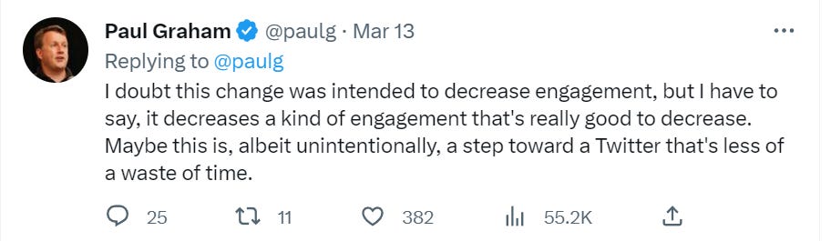 Another thing to notice is that if you respond to a reply, that reply will get substantially more views. So you are doubly incentivized not to engage in places where you don’t want more engagement. That seems good.