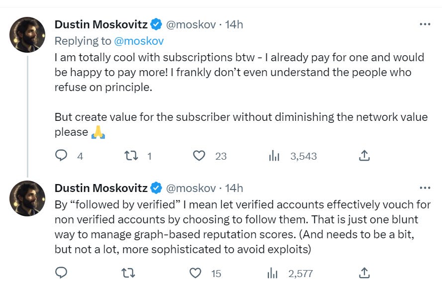 The most obvious is the default. Elon Musk wants you to pay, so he’s improving the value proposition to get more people to pay. If 80% of impressions are algorithmic and you only get those by paying, and 5% of people pay, many users will get an order of magnitude or more extra impressions by paying. That’s great value.