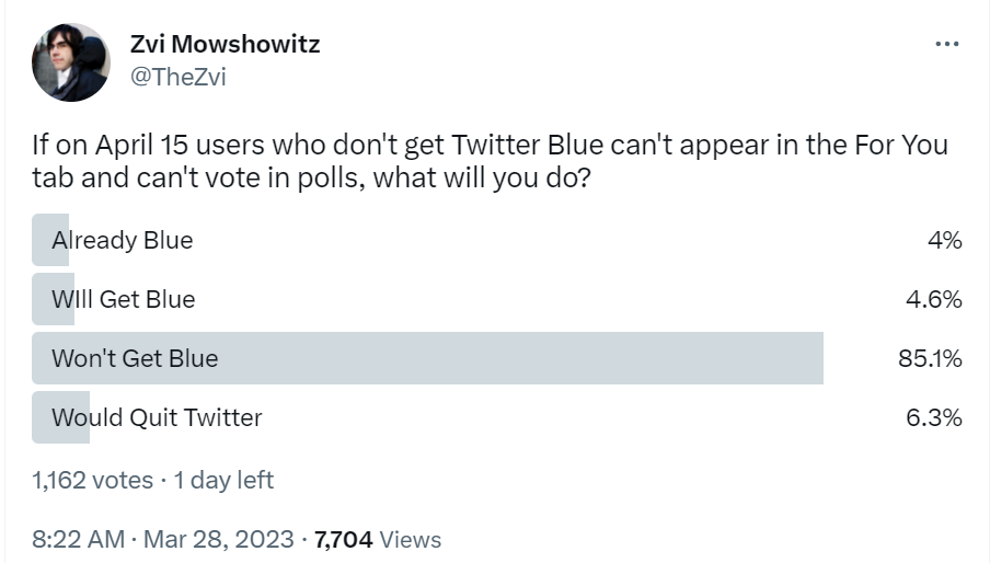 Twitter Blue subscriptions should jump modestly, at least for a time. I don’t expect the full more-than-doubling that we would have gotten if you were facing complete exile from the For You tab.