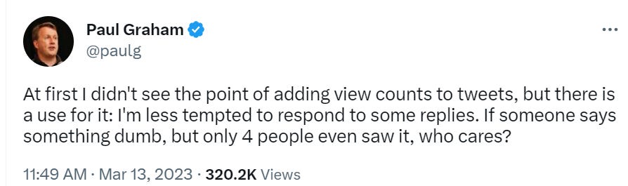 View counts also tell you the ratios of response. How many replies or likes or bookmarks did you get? That number is a numerator. Without the denominator, it greatly lacks context.