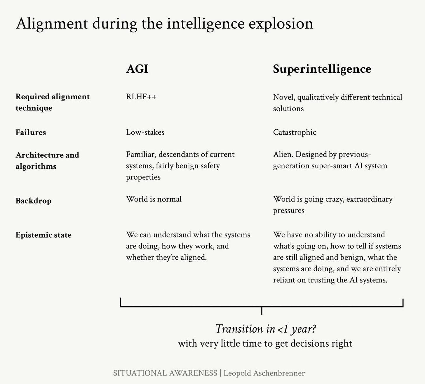 Leopold acknowledges that we currently only have guesswork and half-baked ideas on the technical side, that this field is extremely young, that many aspects of the problem look impossibly difficult (see attached image), and that there's a strong chance of this research operation getting us all killed. "To be clear, given the stakes, I think 'muddling through' is in some sense a terrible plan. But it might be all we’ve got." Controllable superintelligent AI is a far more speculative idea at this point than superintelligent AI itself.