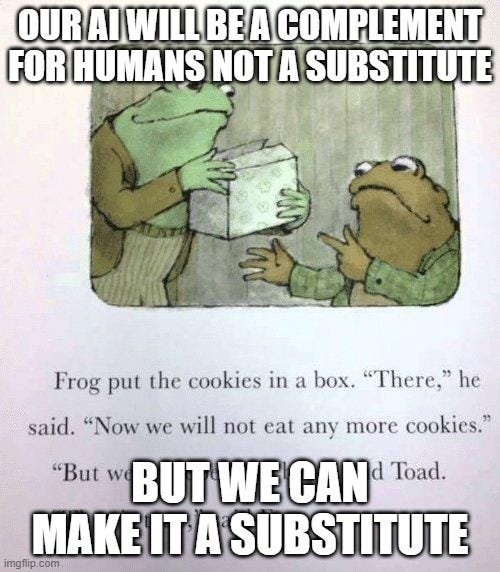 Oh, OpenAI said at the summit, we’ll simply only build the kind that complements humans, not the kind that substitutes for humans. It’ll be fine.