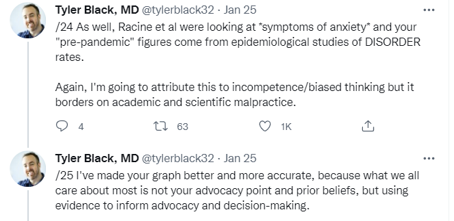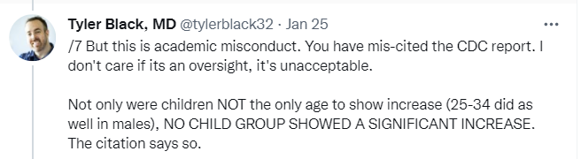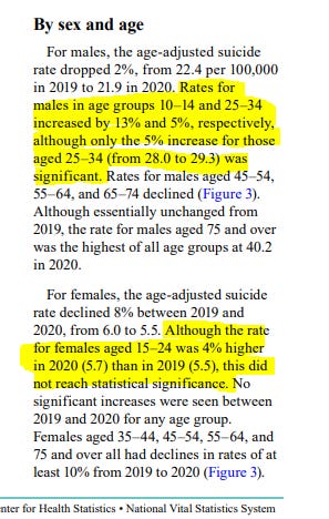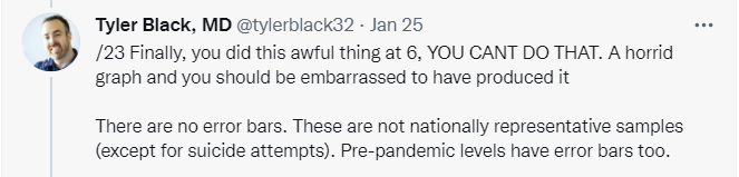 I’m going to assume he meant ‘from 2019’ here, but what seems to be happening is we have a clear long-term trendline of increasing suicides, in which the years 2017 and 2018 look like outliers that are above the curve, there was a drop from 2018 to 2019 (which is before the pandemic). Then there was an on-pace increase from 2019 to 2020. And then Black is accusing them of scientific misconduct for calling this increase an increase? Because while it was an increase, other groups also showed an increase, and it wasn’t ‘significant’? So you can’t say that a number went up if p<0.05? This is from the thread: