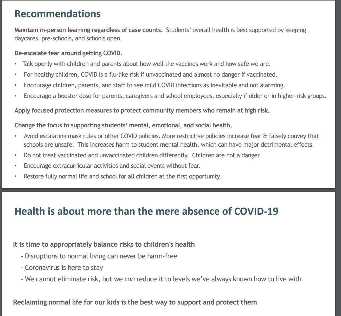 Mostly it’s calling for everyone to discuss the situation and the facts, and stating the obvious, which is that kids are not at much risk from Covid-19.