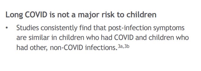 3b very explicitly supports their conclusion. 3a is a complex meta-analysis mainly about adults, and it wasn’t trivial to figure out if it was supporting. The whole issue is indeed confusing, and there are studies one could cite on both sides, so I’m going to presume they found one that supports their claim. I still owe everyone The Long Long Covid post and hopefully will find time to write it soon. I do think they are essentially correct in practice, and Long Covid is not a substantially worse risk to children than Long Flu on a per-case basis.