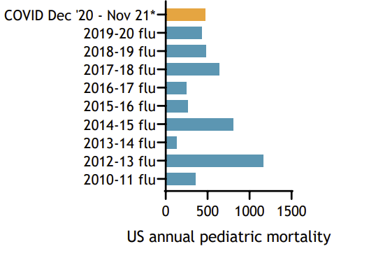 What this actually shows, if we take the 199 to be a baseline, is that Covid-19 deaths during the Delta period and largely without vaccinations were roughly double the rate of flu, when we include the big peaks. If you do common sense on that math, you see that the risk to children going forward, a few weeks from now, is minimal even by these comparisons.