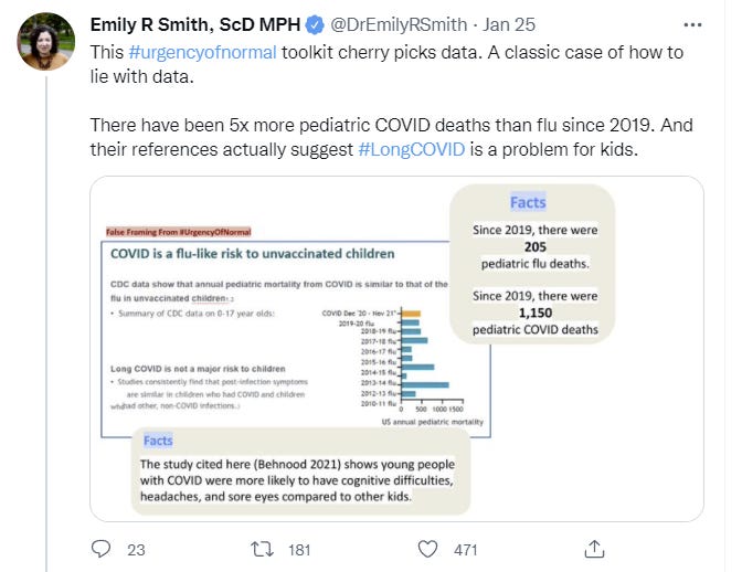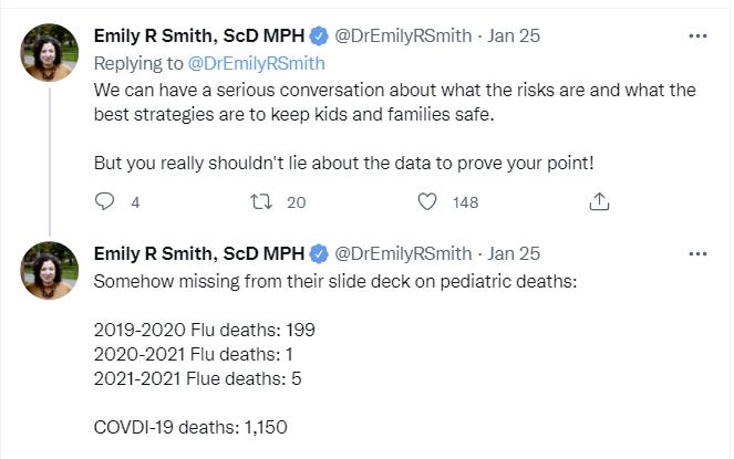 And yes, she obviously wants both the points from preventing flu, and the points for Covid being so much more common than flu. And wants to ignore that these statistics are mostly pre-vaccination and pre-Omicron, of course, but never mind that.