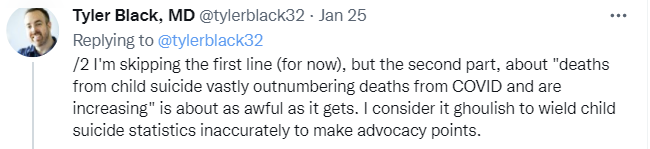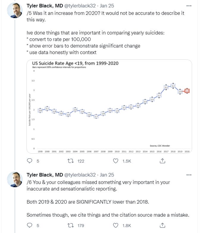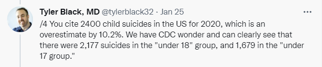 I notice I am confused (and including the Under 17 number seems like pure framing). How is a 10.2% overstatement ‘as awful as it gets’? I’ll assume for the moment Black’s numbers are right. It’s an error, but seems unlikely to be a dishonest one, and in what way does it even change the conclusion? Remember, there are 1,150 Covid deaths over two years. If there were 2,177 suicides in the year 2020, and we assume a similar number for 2021, then that’s about a factor of four more deaths than Covid. That sounds to me like a reasonable use of ‘vastly outnumbering,’ and not substantially different than if it was a factor of a little under five.