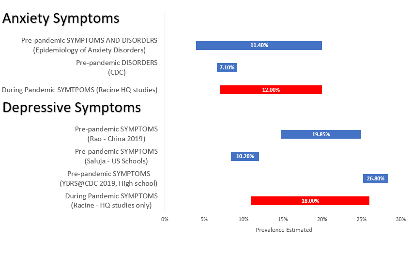 Conclusions and Relevance Pooled estimates obtained in the first year of the COVID-19 pandemic suggest that 1 in 4 youth globally are experiencing clinically elevated depression symptoms, while 1 in 5 youth are experiencing clinically elevated anxiety symptoms. These pooled estimates, which increased over time, are double of prepandemic estimates. An influx of mental health care utilization is expected, and allocation of resources to address child and adolescent mental health concerns are essential.