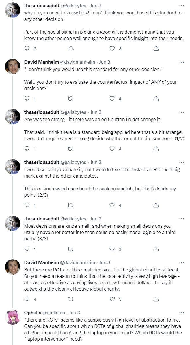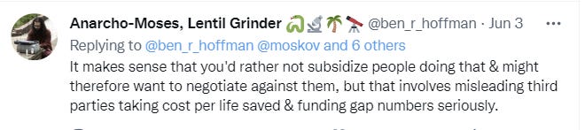 Ben also disagreed with the math that there was lots of opportunity, linking to his post A Drowning Child is Hard to Find.