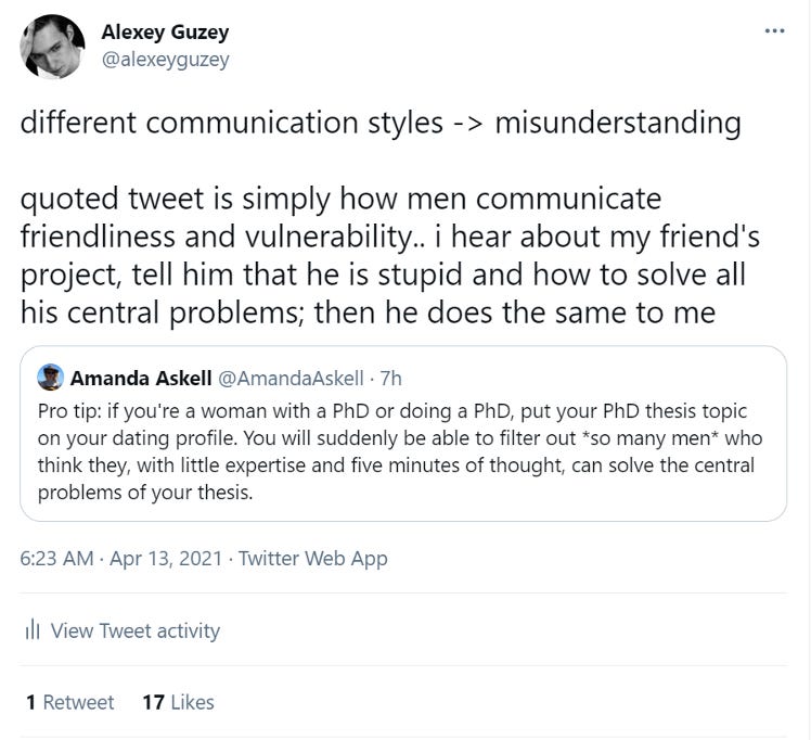 Alexey is modeling this as 'take an interest by exploring various intuitions and finding out what is hard or interesting.’ Amanda is modeling this as ‘the mansplainer thinks he has actually solved the problem.’