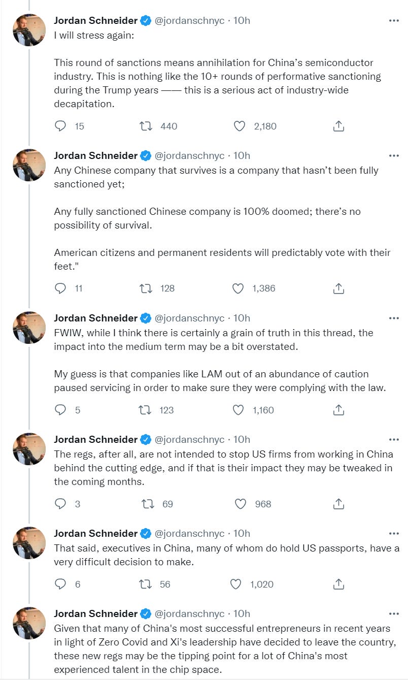 Jordan Schneider reports that Biden’s new chip controls de facto forced every American in China’s semiconductor industry to resign on the spot on pain of losing citizenship, which all of them promptly did. Also that ASML and TSMC have cut China off. At first his instinct was that this completely kills the Chinese chip industry dead. On consideration he backed that up a bit.